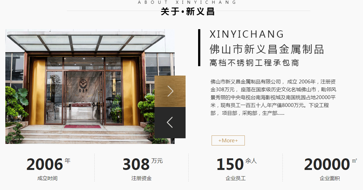 佛山市新義昌金屬制品有限公司,成立于2006年,注冊資金308萬元,座落在歷史文化名城佛山市,毗鄰風景秀麗的南海影視城及南國桃園占地20000平米,現有員工一百五十人,年產值8000萬元;下設外貿部、預結算部、工程部、項目部、綜合生產部、焊接部、激光切割部、財務部、采購部、行政部、折彎部、質管部。本公司致于不銹鋼裝飾工程行業文化的發展,并擁有一批高素質的工程技術人員,技術力量雄厚,公司下屬多支專業不銹鋼裝飾工程施工隊伍,三個大型鈑金機加工車間和完善的售后服務隊伍。公司擁有數控機床(剪、刨、沖、折)、激光切割、精密激光焊接等硬件設備;公司經過數年發展,擁有豐富的不銹鋼裝飾裝修經驗,且在行業內擁有較高的聲譽,是集設計、生產、加工、制作、安裝于一體的專業不銹鋼裝飾工程公司。