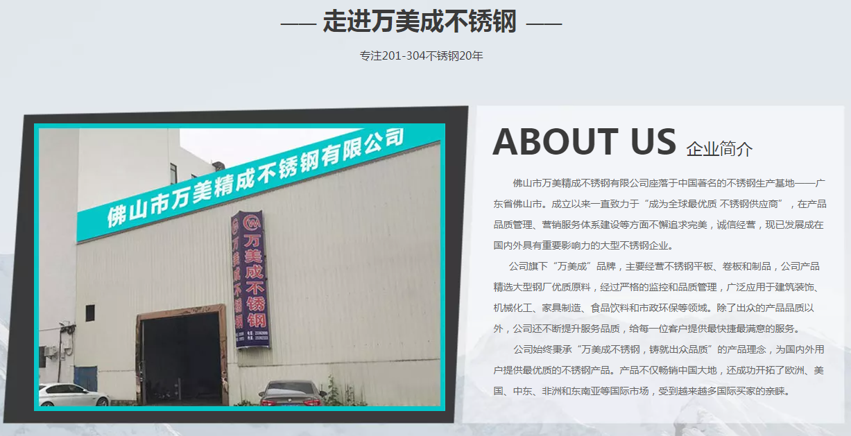 佛山市萬美精成不銹鋼有限公司座落于的不銹鋼生產基地——廣東省佛山市。在產品品質管理、營銷服務體系建設等方面不懈追求,誠信經營,現已發展成在國內外具有重要影響力的大型不銹鋼企業。