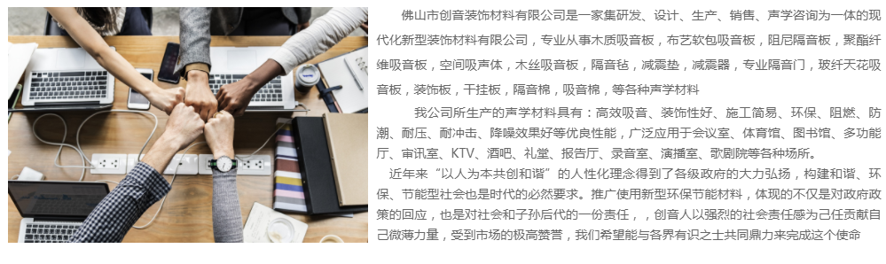 佛山創音——專業生產吸音板,隔音板,阻燃防潮,聲學降噪吸音裝飾材料工程定制-廠家直供佛山創音、木質吸音板、聚酯纖維吸音板、布藝吸音軟包、阻尼隔音板、隔音棉、木絲吸音板、空間吸聲體、砂巖吸音板、碳素吸音板、玻纖天花吸音板、穿孔吸音板、微孔吸音板、會議室吸音板、酒吧隔音、體育館吸聲板、音樂教室吸音板、審訊室防撞軟包。