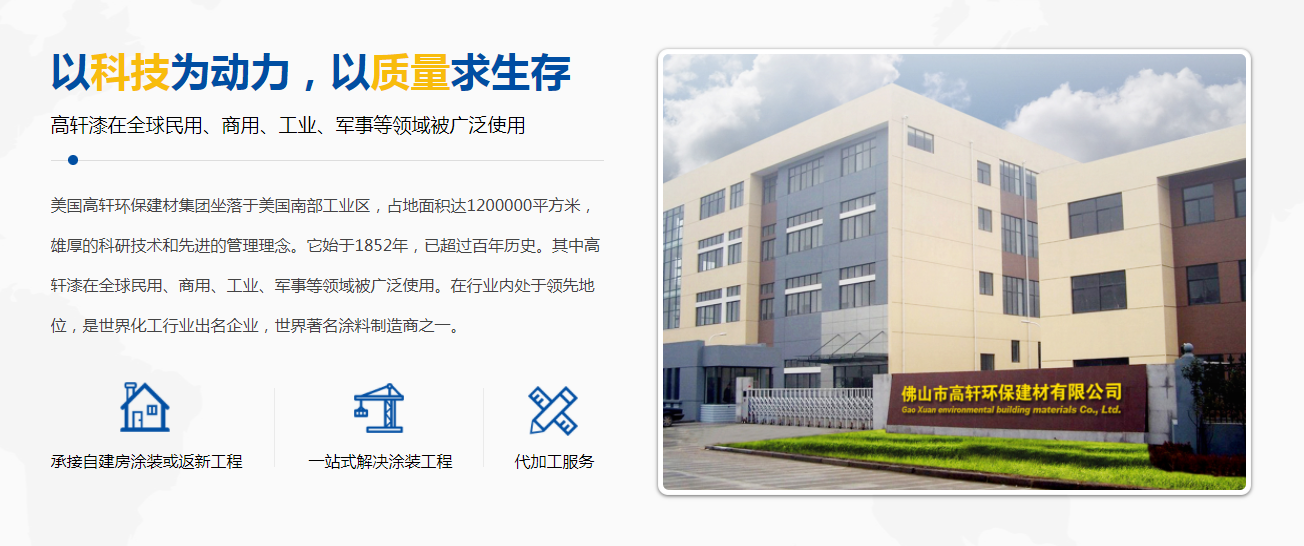 佛山市高軒環保建材有限公司是一家專注建筑工程涂料(外墻涂料、內墻涂料、質感外墻涂料、花崗石多彩漆、水包砂仿石漆、真石漆、巖片漆和工業地坪涂料的生產、銷售、施工為一體的涂料企業。是國內專業建筑工程涂料生產商之一。高軒建材有限公司位于華南美麗城市有涂料之鄉”美譽之稱的廣東佛山。憑著優越的地理位置先進的生產工藝和技術力量,完善的售后服務,不斷開拓創新,形成一家專業的建筑工程涂料生產企業。