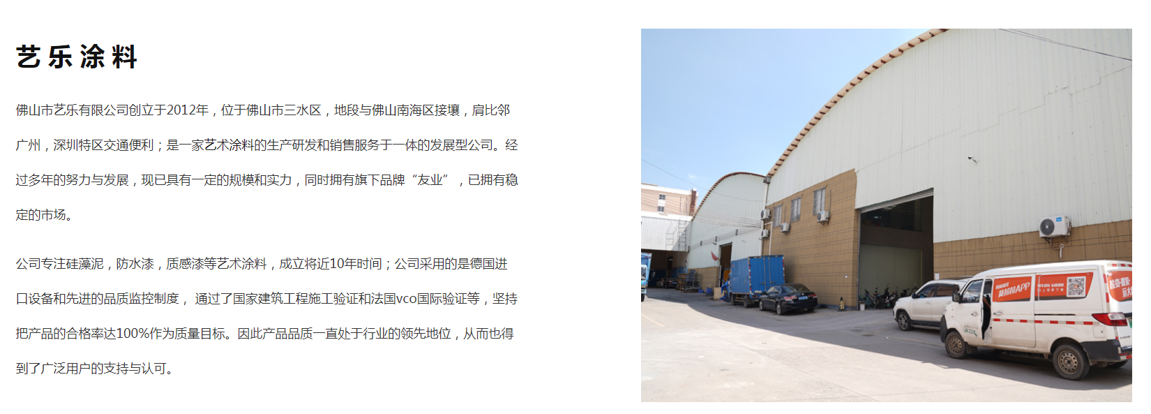 佛山市藝樂有限公司創立于2012年,位于佛山市三水區,地段與佛山南海區接壤,肩比鄰廣州,深圳;是一家涂料的生產研發和銷售服務于一體的發展型公司。經過多年的努力與發展,現已具有的規模和實力,同時擁有旗下品牌“友業”,已擁有穩定的市場。公司專注硅藻泥,質感漆等藝術涂料,成立將近10年時間;公司采用的是進口設備和先進的品質監控制度, 通過了國家建筑工程施工驗證和vco驗證等,堅持把產品的合格作為質量目標。因此產品品質一直處于行業的地位,從而也得到了廣泛用戶的支持與認可。