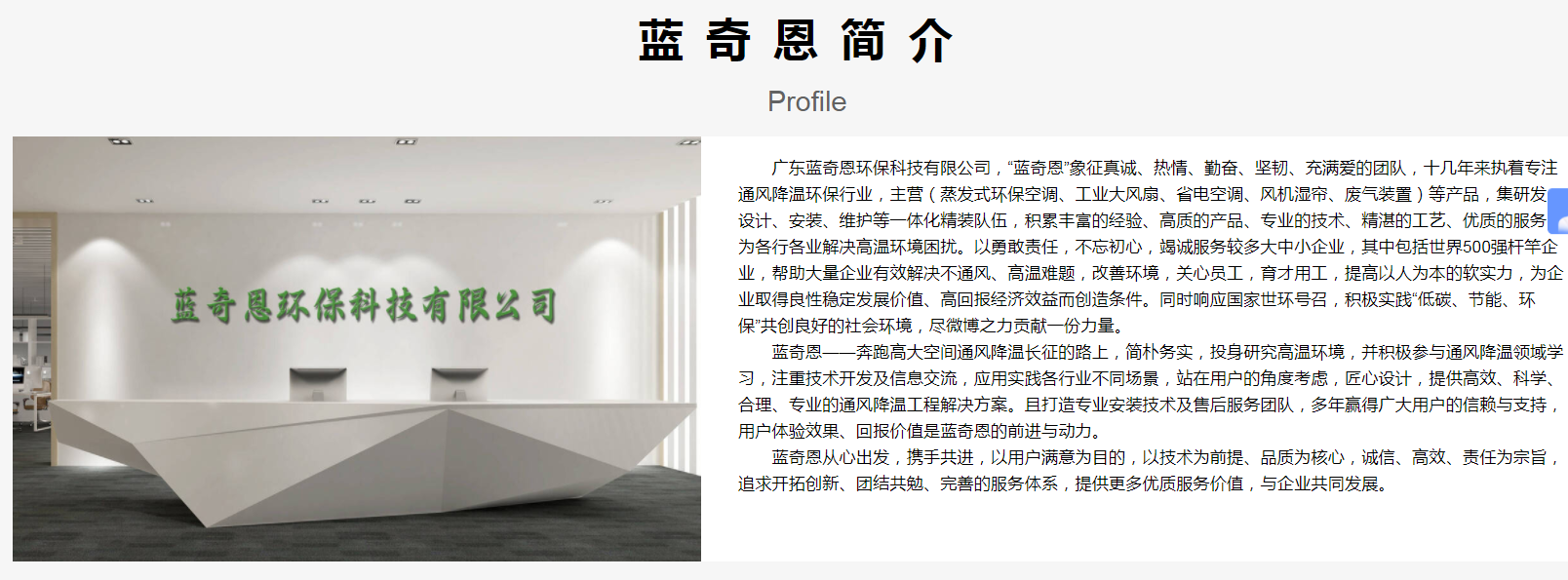 廣東藍(lán)奇恩環(huán)保科技有限公司,“藍(lán)奇恩”象征真誠(chéng)、熱情、勤奮、堅(jiān)韌、充滿愛(ài)的團(tuán)隊(duì),十幾年來(lái)執(zhí)著專注通風(fēng)降溫行業(yè),主營(yíng)(工業(yè)大風(fēng)扇、省電空調(diào)、風(fēng)機(jī)濕簾、廢氣裝置)等產(chǎn)品,集研發(fā)、設(shè)計(jì)、安裝、維護(hù)等一體化精裝隊(duì)伍,積累豐富的經(jīng)驗(yàn)、高質(zhì)的產(chǎn)品、專業(yè)的技術(shù),為各行各業(yè)解決高溫環(huán)境困擾。以勇敢責(zé)任,不忘初心,竭誠(chéng)服務(wù)較多大中小企業(yè),其中包括世界500強(qiáng)桿竿企業(yè),幫助大量企業(yè)解決不通風(fēng)、高溫難題,關(guān)心員工,育才用工,提高以人為本的軟實(shí)力,為企業(yè)取得良性穩(wěn)定發(fā)展價(jià)值、高回報(bào)經(jīng)濟(jì)效益而創(chuàng)造條件。同時(shí)響應(yīng)國(guó)家世環(huán)號(hào)召,積極實(shí)踐“低碳、節(jié)能”共創(chuàng)良好的社會(huì)環(huán)境,盡微博之力貢獻(xiàn)一份力量。