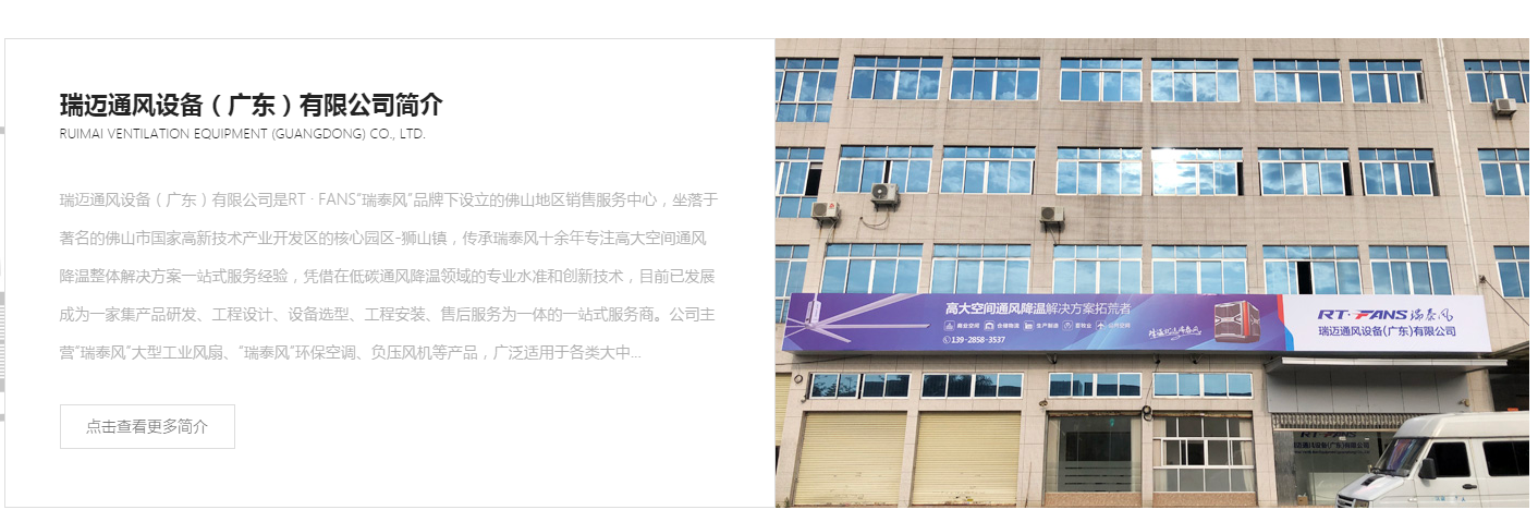 瑞邁通風設備(廣東)有限公司是RT · FANS“瑞泰風”品牌下設立的佛山地區銷售服務中心,坐落于佛山市國家高新技術產業開發區的核心園區-獅山鎮,傳承瑞泰風十余年專注高大空間通風降溫整體解決方案一站式服務經驗,憑借在低碳通風降溫領域的專業水準和創新技術,目前已發展成為一家集產品研發、工程設計、設備選型、工程安裝、售后服務為一體的一站式服務商。公司主營“瑞泰風”大型工業風扇、“瑞泰風”負壓風機等產品,廣泛適用于各類大中...