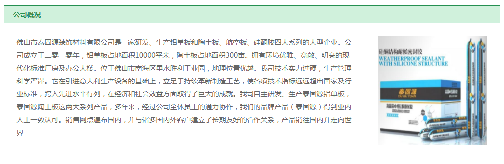 佛山市泰固源裝飾材料有限公司是一家研發、生產鋁單板和陶土板、航空板、硅酮膠四大系列的大型企業。公司成立于二零一零年,鋁單板占地面積10000平米,陶土板占地面積300畝。擁有環境優雅、寬敞、明亮的現代化標準廠房及辦公大樓。位于佛山市南海區里水勝利工業園,地理位置優越。我司技術實力過硬,生產管理科學嚴謹。它在引進生產設備的基礎上,立足于持續革新制造工藝,使各項技術指標遠遠超出國家及行業標準,跨..