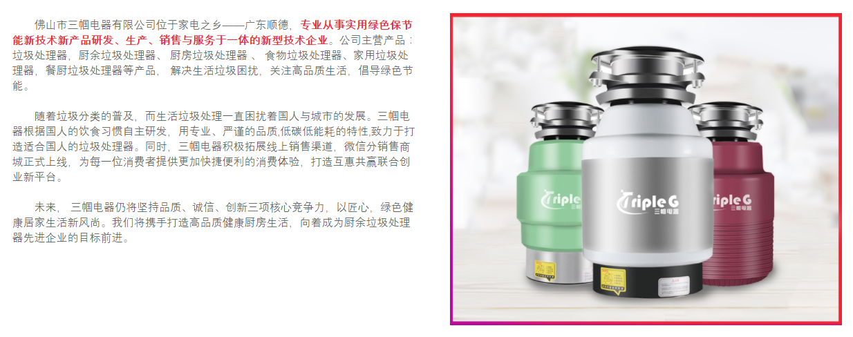 今天分享一個廚余垃圾處理器網站設計案例——佛山市三幗電器有限公司