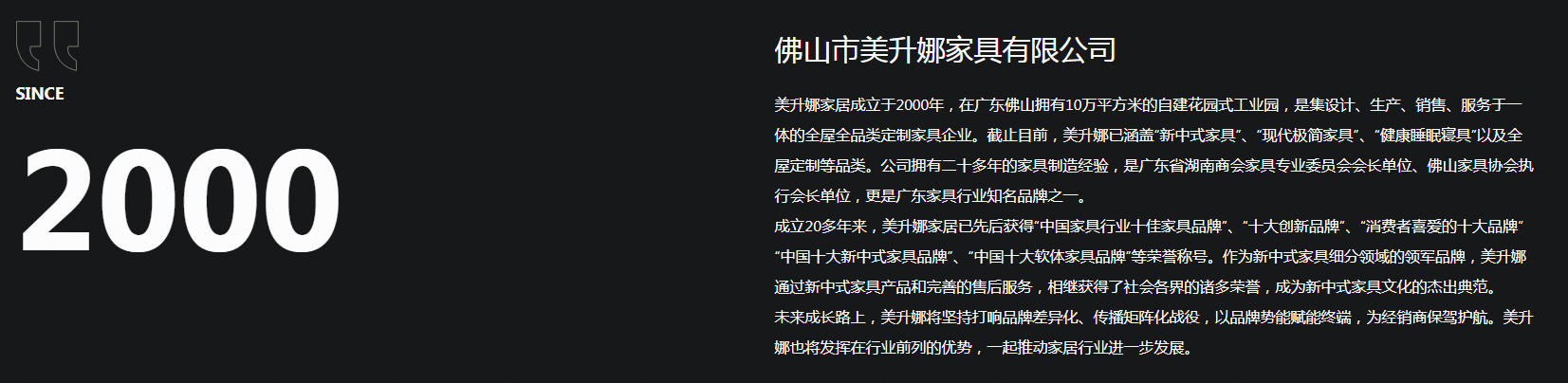 美升娜家居成立于2000年,在廣東佛山擁有10萬平方米的自建花園式工業園,是集設計、生產、銷售、服務于一體的全屋全品類定制家具企業。截止目前,美升娜已涵蓋新中式家具、現代家具、健康睡眠寢具以及全屋定制等品類。公司擁有二十多年的家具制造經驗,是廣東省湖南商會家具專業委員會會長單位、佛山家具協會執行會長單位,更是廣東家具行業。