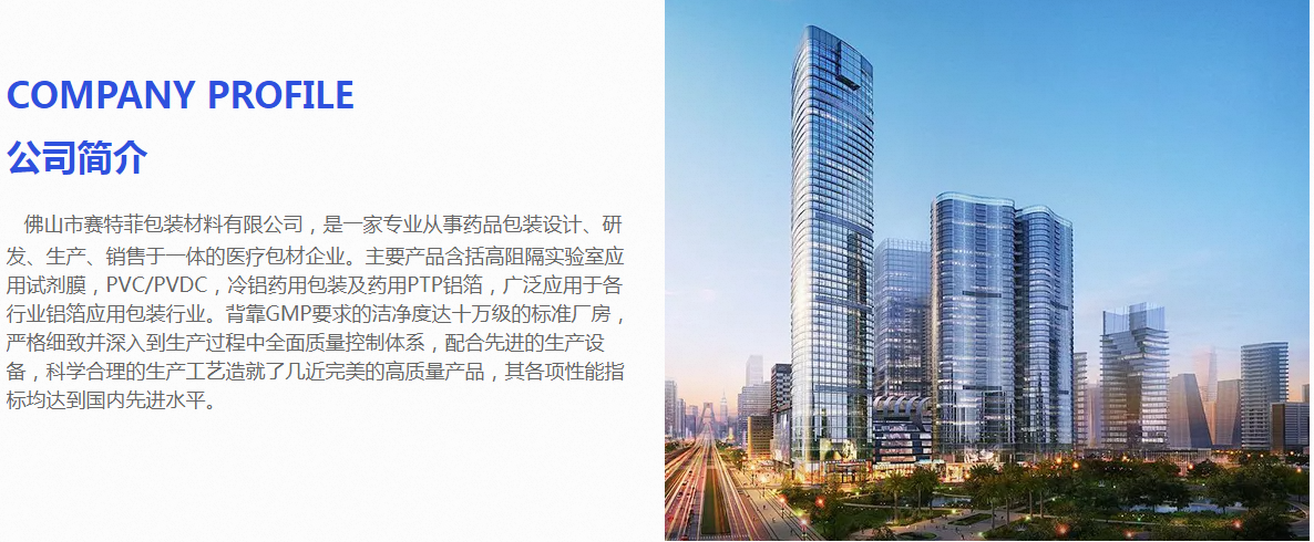 佛山市賽特菲包裝材料有限公司,是一家專業(yè)從事藥品包裝設(shè)計、研發(fā)、生產(chǎn)、銷售于一體的包材企業(yè)。主要產(chǎn)品含括高阻隔實驗室應(yīng)用試劑膜,PVC/PVDC,冷鋁包裝及PTP鋁箔,廣泛應(yīng)用于各行業(yè)鋁箔應(yīng)用包裝行業(yè)。背靠GMP要求的潔凈度達(dá)十萬級的標(biāo)準(zhǔn)廠房,嚴(yán)格細(xì)致并深入到生產(chǎn)過程中全面質(zhì)量控制體系,配合先進(jìn)的生產(chǎn)設(shè)備,科學(xué)合理的生產(chǎn)工藝造就了的高質(zhì)量產(chǎn)品,其各項性能指標(biāo)均達(dá)到國內(nèi)先進(jìn)水平。