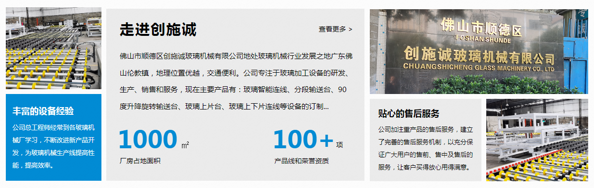 佛山市順德區創施誠玻璃機械有限公司地處玻璃機械行業發展之地廣東佛山倫教鎮,地理位置優越。公司專注于玻璃加工設備的研發、生產、銷售和服務,現在主要產品有:玻璃智能連線、分段輸送臺、90度升降旋轉輸送臺、玻璃上片臺、玻璃上下片連線等設備的訂制。
