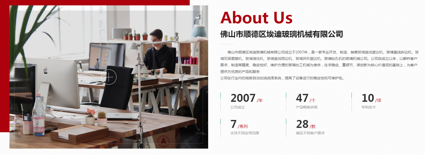 佛山市順德區(qū)埃迪玻璃機(jī)械有限公司成立于2007年,是一家專業(yè)開(kāi)發(fā)、制造、銷售玻璃直線磨邊機(jī)、玻璃直線斜邊機(jī)、玻璃雙面覆膜機(jī)、玻璃清洗機(jī)、玻璃直線圓邊機(jī)、玻璃異形磨邊機(jī)、玻璃鉆孔機(jī)的玻璃機(jī)械公司。公司自成立以來(lái),以解析客戶需求、制造高精度、穩(wěn)定性好、維護(hù)方便的玻璃加工機(jī)械為使命,在求穩(wěn)定、重細(xì)節(jié)、謀創(chuàng)新為核心價(jià)值觀的基礎(chǔ)上,為客戶提供產(chǎn)品和服務(wù)