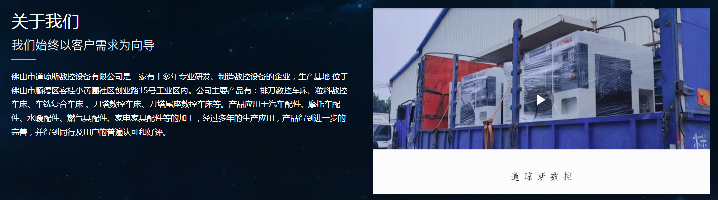 佛山市道瓊斯數控設備有限公司是一家有十多年專業研發、制造數控設備的企業,生產基地 位于佛山市順德區容桂小黃圃社區創業路15號工業區內。公司主要產品有:排刀數控車床、粒料數控車床、車銑復合車床 、刀塔數控車床、刀塔尾座數控車床等。產品應用于汽車配件、摩托車配件、水暖配件、燃氣具配件、家電家具配件等的加工,經過多年的生產應用,產品得到進一步的完善,并得到同行及用戶的普遍認可和好評。