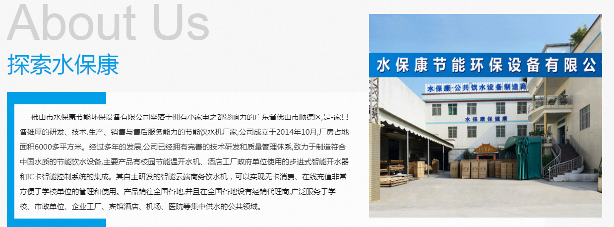 佛山市水保康節(jié)能設(shè)備有限公司坐落于擁有小家電之都影響力的廣東省佛山市順德區(qū),是-家具備雄厚的研發(fā)、技術(shù).生產(chǎn)、銷售與售后服務(wù)能力的節(jié)能飲水機廠家,公司成立于2014年10月,廠房占地面積6000多平方米。經(jīng)過多年的發(fā)展,公司已經(jīng)擁有完善的技術(shù)研發(fā)和質(zhì)量管理體系,致力于制造符合國人水質(zhì)的節(jié)能飲水設(shè)備,主要產(chǎn)品有校園節(jié)能溫開水機、酒店工廠政府單位使用的步進式智能開水器和IC卡智能控制系統(tǒng)的集成。其自主研發(fā)的智能云端商務(wù)飲水機,可以實現(xiàn)無卡消費、在線充值非常方便于學校單位的管理和使用。產(chǎn)品銷往各地,并且在各地設(shè)有經(jīng)銷代理商,廣泛服務(wù)于學校、市政單位、企業(yè)工廠、賓館酒店、機場、醫(yī)院等集中供水的公共領(lǐng)域。