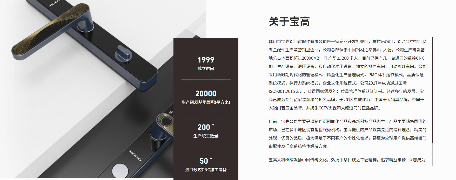 佛山市寶高鋁門窗配件有限公司是一家專業(yè)開發(fā)折疊門,推拉吊趟門,鋁合金中控門窗五金配件生產(chǎn)兼營銷型企業(yè),公司總部位于鋁材之都佛山·大瀝。公司生產(chǎn)研發(fā)基地總占地面積超過20000M2 ,生產(chǎn)職工 200 多人,目前已擁有幾十臺進口的數(shù)控CNC加工生產(chǎn)設(shè)備,鍛壓設(shè)備,和自動化沖壓設(shè)備,獨立的拋光車間,自動噴砂車間。公司采用新時期現(xiàn)代化的管理模式:精益化生產(chǎn)管理模式,PMC 體系運作模式,系統(tǒng)模式,執(zhí)行力系統(tǒng)模式,企業(yè)文化系統(tǒng)模式。公司2017年成功通過 ISO9001:2015認證,獲得頒發(fā)的:質(zhì)量管理體系認證證書。經(jīng)過多年的發(fā)展,寶高已成為鋁門窗家裝領(lǐng)域的品牌,于2018 年被評為:十大鎖具品牌,十大鋁門窗五金品牌,并攜手四大頻道同時直播品牌。