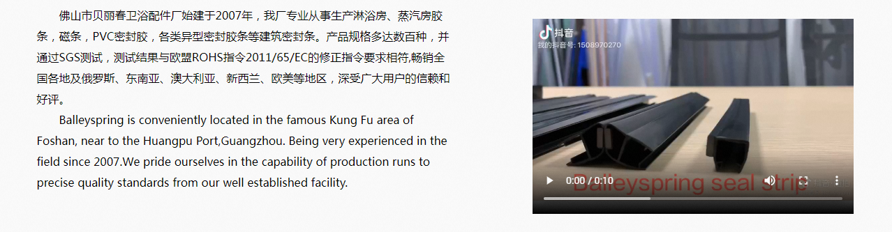 佛山市貝麗春衛(wèi)浴配件廠始建于2007年,我廠專業(yè)從事生產(chǎn)淋浴房、蒸汽房膠條,磁條,PVC密封膠,各類異型密封膠條等建筑密封條。產(chǎn)品規(guī)格多達(dá)數(shù)百種,并通過SGS測試,測試結(jié)果與ROHS指令2011/65/EC的修正指令要求相符,銷往各地,深受廣大用戶的信賴和好評。