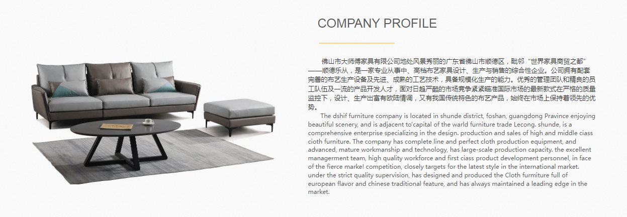 佛山市大師傅家具有限公司地處風景秀麗的廣東省佛山市順德區,毗鄰“世界家具商貿之都”——順德樂從,是一家專業從事中、布藝家具設計、生產與銷售的綜合性企業。公司擁有配套完善的布藝生產設備及先進、成熟的工藝技術,具備規模化生產的能力。管理團隊和精良的員工隊伍的產品開發人才,面對日趨嚴酷的市場競爭緊緊瞄準市場的新款式在嚴格的質量監控下,設計、生產出富有歐陸情調,又有我國傳統特色的布藝產品,始終在市場上保持著優勢。