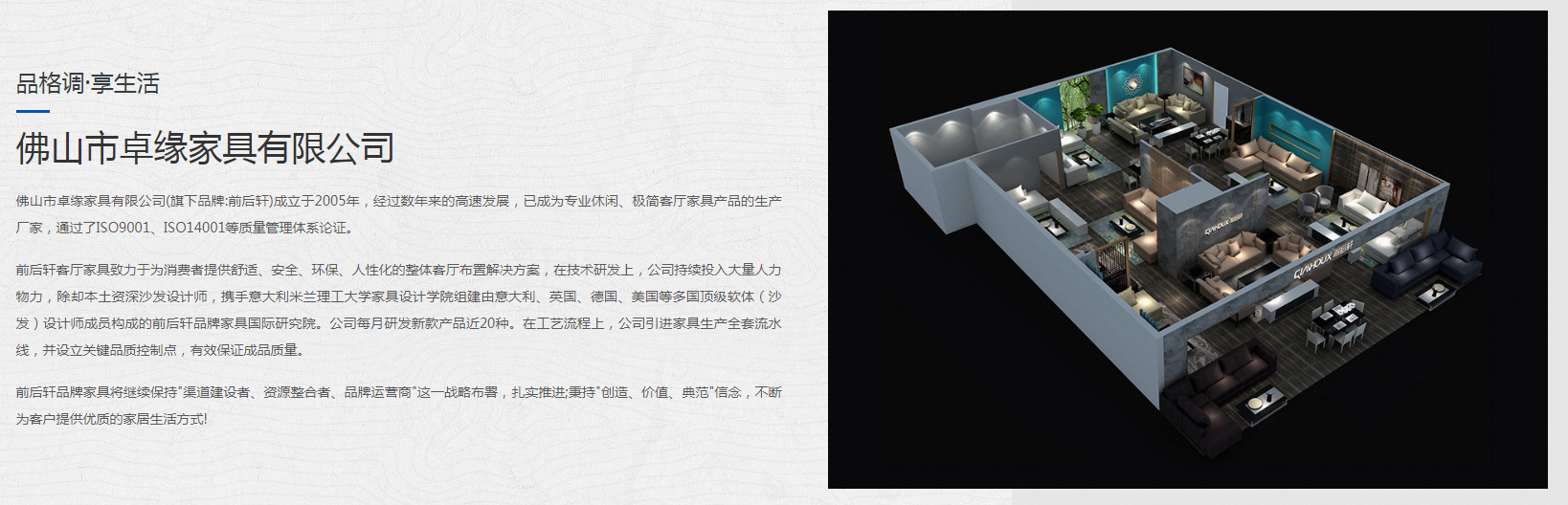 佛山市卓緣家具有限公司(旗下品牌:前后軒)成立于2005年,經過數年來的高速發展,已成為專業休閑、客廳家具產品的生產廠家,通過了ISO9001、ISO14001等質量管理體系論證。