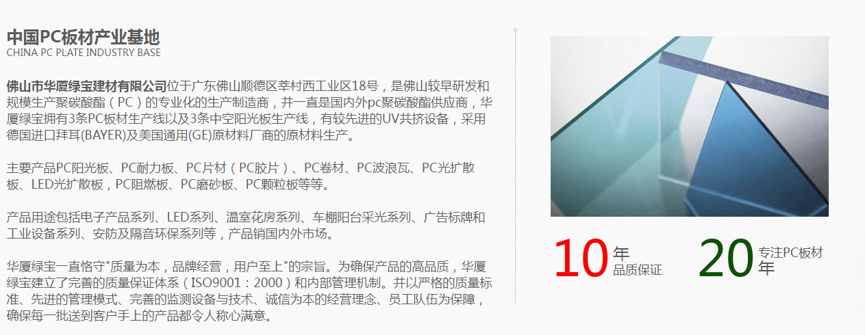 華廈綠寶建材主營產(chǎn)品PC耐力板、PC陽光板、PC片材、PC卷材、PC波浪瓦、PC光擴(kuò)散板、LED光擴(kuò)散板,PC阻燃板、PC磨砂板、PC顆粒板等,是佛山較早研發(fā)和規(guī)模生產(chǎn)聚碳酸酯(PC)的專業(yè)化的生產(chǎn)制造商,并一直是國內(nèi)外pc聚碳酸酯供應(yīng)商,擁有3條PC板材生產(chǎn)線以及3條中空陽光板生產(chǎn)線,有先進(jìn)的UV共擠設(shè)備,采用進(jìn)口拜耳(BAYER)及通用(GE)原材料廠商的原材料生產(chǎn)