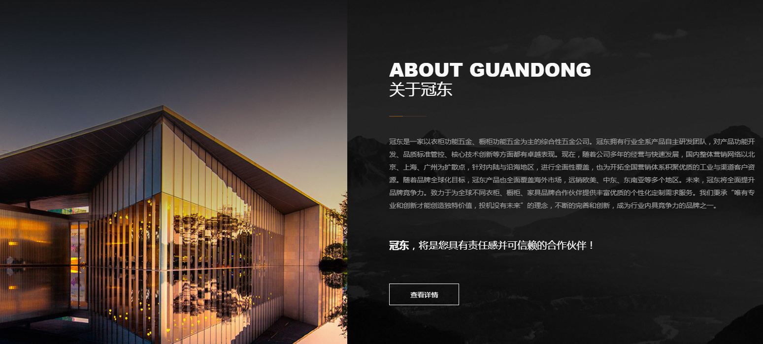冠東是一家以衣柜功能五金、櫥柜功能五金為主的綜合性五金公司。冠東擁有行業(yè)全系產(chǎn)品自主研發(fā)團(tuán)隊(duì),對(duì)產(chǎn)品功能開(kāi)發(fā)、品質(zhì)標(biāo)準(zhǔn)管控、核心技術(shù)創(chuàng)新等方面都有很好表現(xiàn)。現(xiàn)在,隨著公司多年的經(jīng)營(yíng)與快速發(fā)展,國(guó)內(nèi)整體營(yíng)銷網(wǎng)絡(luò)以北京、上海、廣州為擴(kuò)散點(diǎn),針對(duì)內(nèi)陸地區(qū),進(jìn)行全面性覆蓋,也為開(kāi)拓營(yíng)銷體系積聚的工業(yè)與渠道客戶資源。隨著品牌目標(biāo),冠東產(chǎn)品也全面覆蓋海外市場(chǎng),遠(yuǎn)銷多個(gè)地區(qū)。未來(lái),冠東將全面提升品牌競(jìng)爭(zhēng)力。致力于為不同衣柜、櫥柜、家具品牌合作伙伴提供豐富的個(gè)性化定制需求服務(wù)。我們秉承“唯有專業(yè)和創(chuàng)新才能創(chuàng)造價(jià)值,投機(jī)沒(méi)有未來(lái)”的理念,不斷的完善和創(chuàng)新,成為行業(yè)內(nèi)具競(jìng)爭(zhēng)力的品牌。