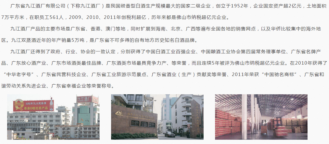廣東省九江酒廠有限公司(下稱九江酒廠)是我國豉香型白酒生產規模大的國家二級企業,創立于1952年,企業固定資產超2億元,土地面積7萬平方米,在職員工561人,2009、2010、2011年創稅利超億,歷年來都是佛山市納稅超億元企業。