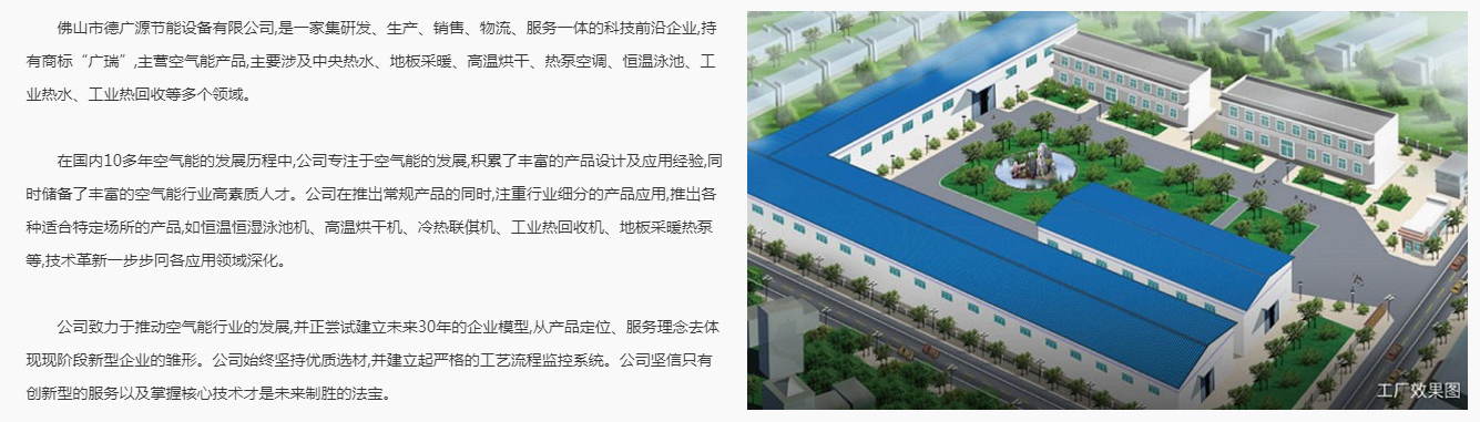 佛山市德廣源節能設備有限公司,是一家集硏發、生產、銷售、物流、服務一體的科技前沿企業,持有商標“廣瑞”,主營空氣能產品,主要涉熱水、地板采暖、高溫烘干、熱泵空調、恒溫泳池、工業熱水、工業熱回收等多個領域。