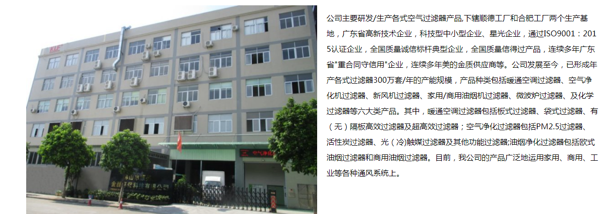佛山市順德區金磊科技有限公司主要研發/生產各式空氣過濾器產品,下轄順德工廠和合肥工廠兩個生產基地,廣東省高新技術企業,科技型中小型企業、星光企業,通過ISO9001:2015認證企業,質量誠信標桿典型企業,質量信得過產品,連續多年廣東省"重合同守信用"企業,連續多年美的金質供應商等。公司發展至今,已形成年產各式過濾器300萬套/年的產能規模,產品種類包括暖通空調過濾器、空氣凈化機過濾器、新風機過濾器、家用/商用油煙機過濾器、微波爐過濾器、及化學過濾器等六大類產品。其中,暖通空調過濾器包括板式過濾器、袋式過濾器、有(無)隔板過濾器及過濾器;空氣凈化過濾器包括PM2.5過濾器、活性炭過濾器、光(冷)觸媒過濾器及其他功能過濾器;油煙凈化過濾器包括歐式油煙過濾器和商用油煙過濾器。目前,我公司的產品廣泛地運用家用、商用、工業等各種通風系統上。