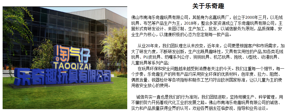 佛山市南海樂奇趣玩具有限公司,其前身為名嘉玩具廠,創(chuàng)立于2000年三月,以毛絨玩具、布藝等產品生產為主,2018年,整合多家資源成立了樂奇趣玩具有限公司,主營形式有研發(fā)設計、來圖訂制、生產加工、批發(fā),以誠信服務為原則,生產為核心,以健康積極的心態(tài)為您定制每一款產品。