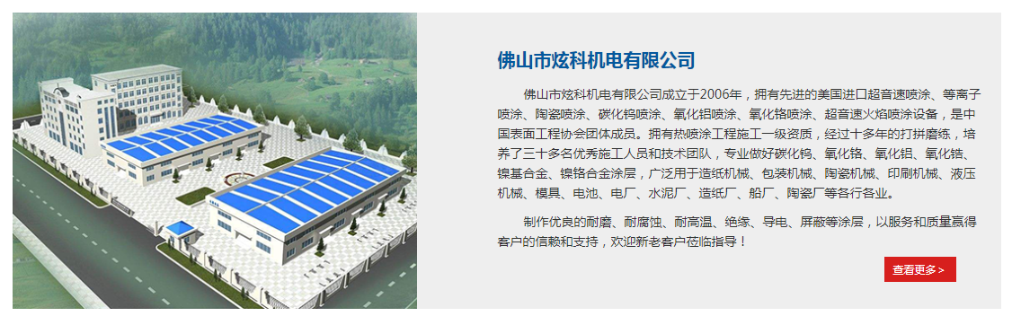 佛山市炫科機(jī)電有限公司成立于2006年,擁有超音速噴涂、等離子噴涂、電弧噴涂、火焰噴涂設(shè)備、碳化鎢噴涂,是表面工程協(xié)會(huì)團(tuán)體成員。擁有熱噴涂工程施工資質(zhì),經(jīng)過十多年的打拼磨練,培養(yǎng)了三十多名施工人員和技術(shù)團(tuán)隊(duì),專業(yè)做好碳化鎢、氧化鉻、氧化鋁、氧化鋯、鎳基合金、鎳鉻合金涂層,廣泛用于造紙機(jī)械、包裝機(jī)械、陶瓷機(jī)械、印刷機(jī)械、液壓機(jī)械、模具、電池、電廠、水泥廠、造紙廠、船廠、陶瓷廠等各行各業(yè)。