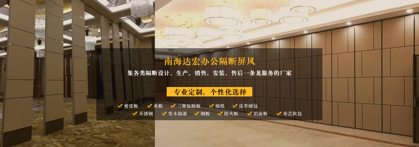 佛山市南海達(dá)宏隔斷屏風(fēng)廠,是活動(dòng)隔斷,移動(dòng)隔斷,活動(dòng)屏風(fēng),玻璃隔斷,辦公室玻璃隔斷,生態(tài)門,隔斷鋁型材,五金配件整套產(chǎn)品研發(fā),設(shè)計(jì),生產(chǎn),安裝,銷售為一體。 自成立以來,一直致力于隔斷技術(shù)的鉆研及開發(fā),創(chuàng)立了專門的研發(fā),一直致力于加強(qiáng)國內(nèi)外隔斷行業(yè)的技術(shù)水平交流和學(xué)習(xí),并研制出具隔音系統(tǒng)和全方向性轉(zhuǎn)彎系統(tǒng)。我們的全部技術(shù)力量,都多年從事于本行業(yè),親自參與過大量的國內(nèi)大型重點(diǎn)工程項(xiàng)目的隔斷系統(tǒng)的制作加工和現(xiàn)場安裝工作,已形成一支成熟的隊(duì)伍遍布各地。 我們信奉“客戶是天,質(zhì)量是地,人和為本”的理念“以服務(wù)爭業(yè)務(wù)、以品質(zhì)創(chuàng)品牌”為宗旨。以好的服務(wù),完善的質(zhì)量,合理的價(jià)格,完善的售后服務(wù)贏得廣大客戶的認(rèn)同及信賴,產(chǎn)品的完善和多樣化配套,滿足了大客戶各種不同空間間隔的使用需求!